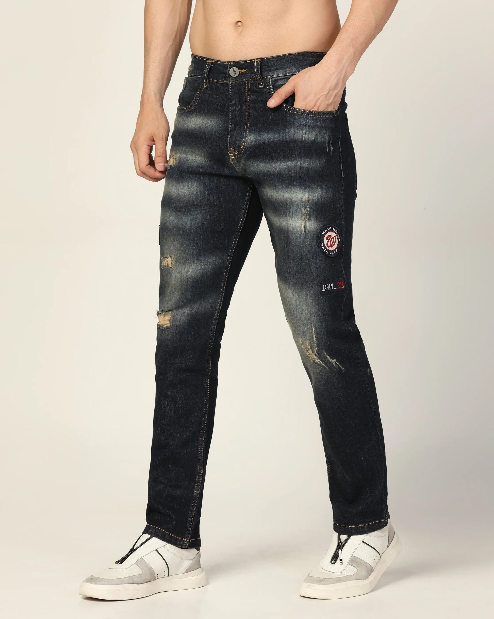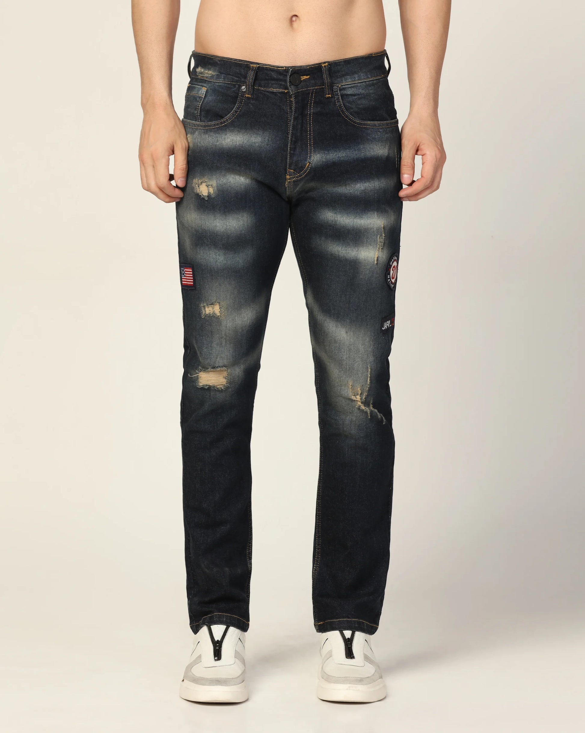 • Pocket/Styling - Has Five pockets / Badges / Distressed effect