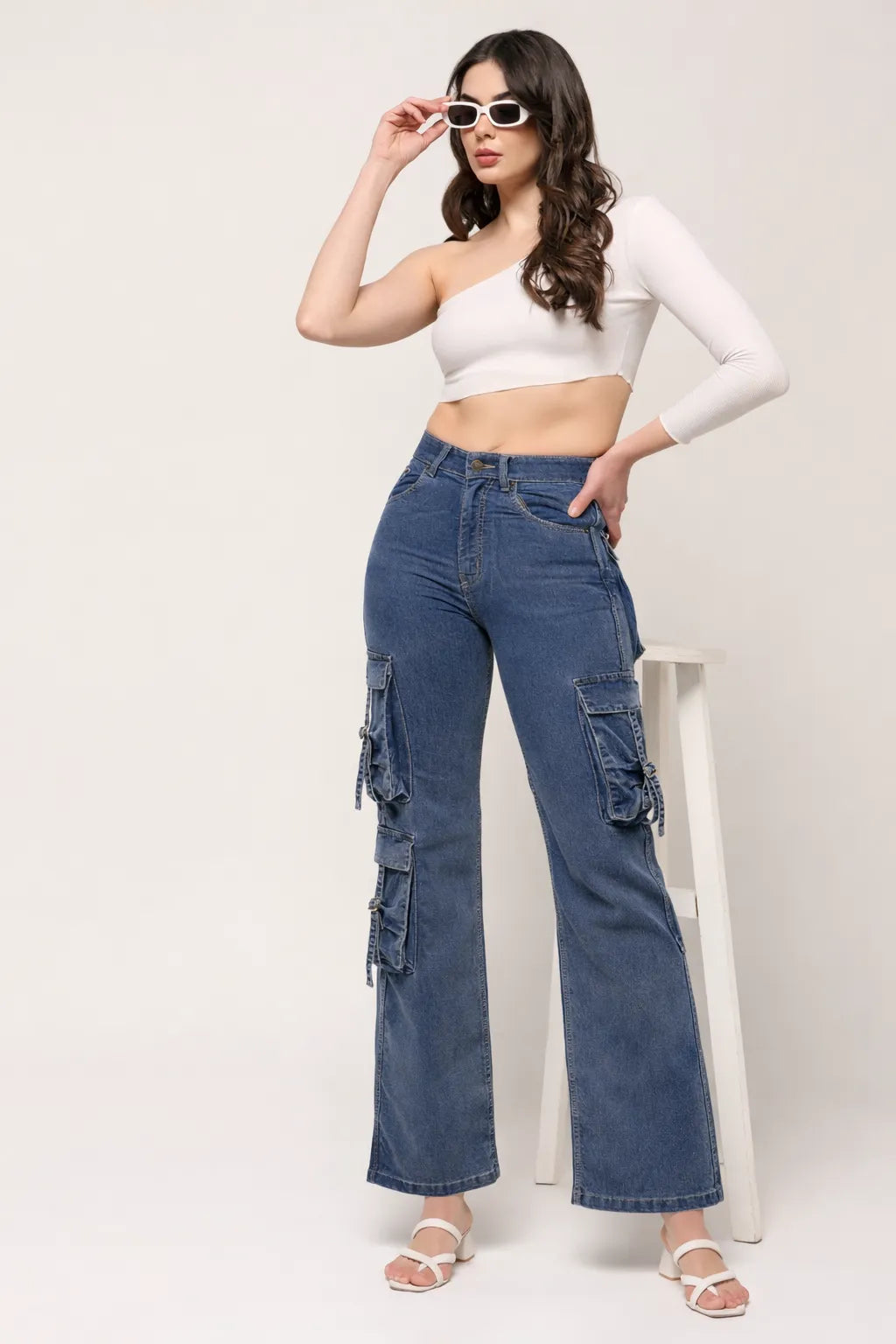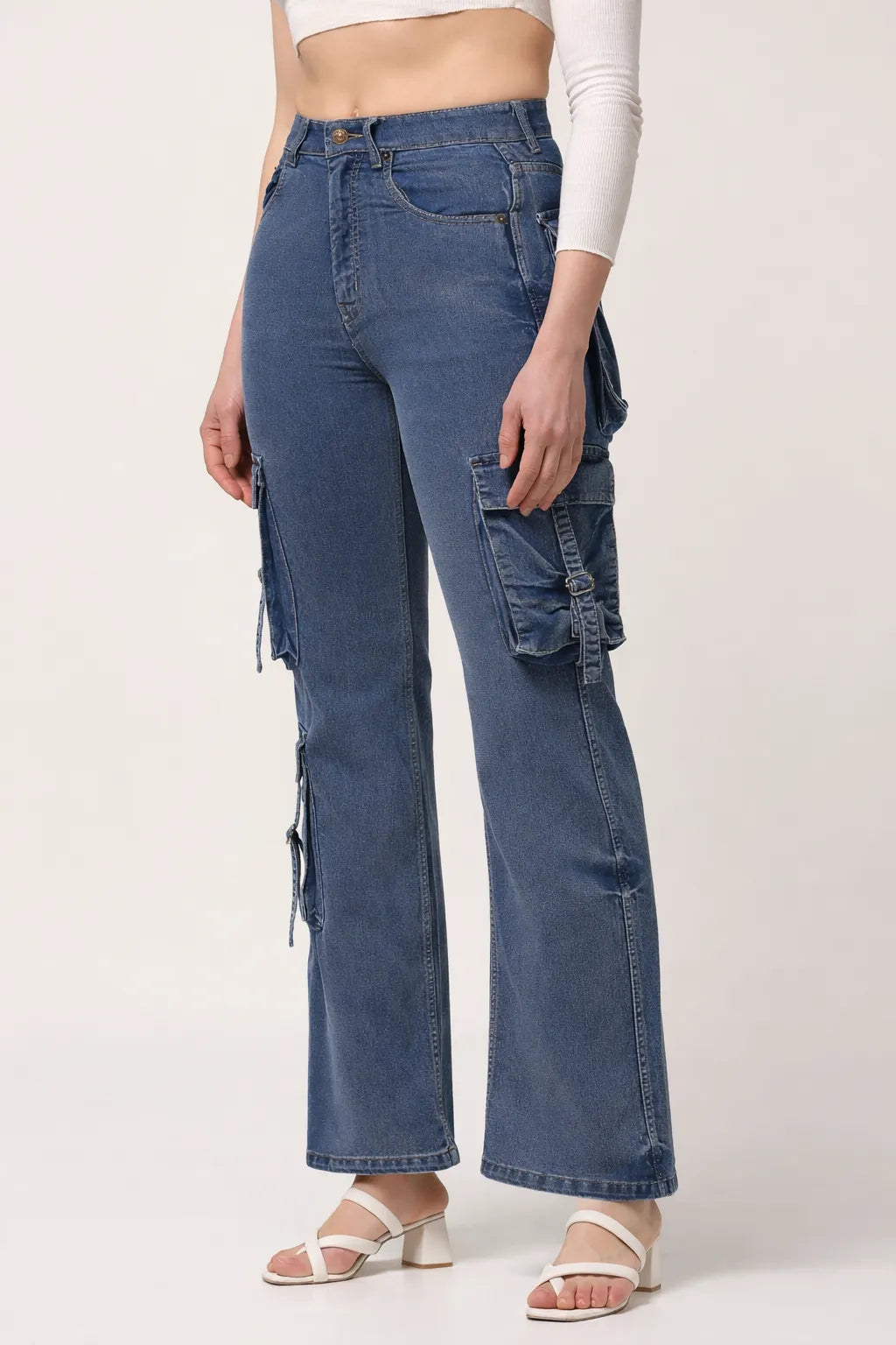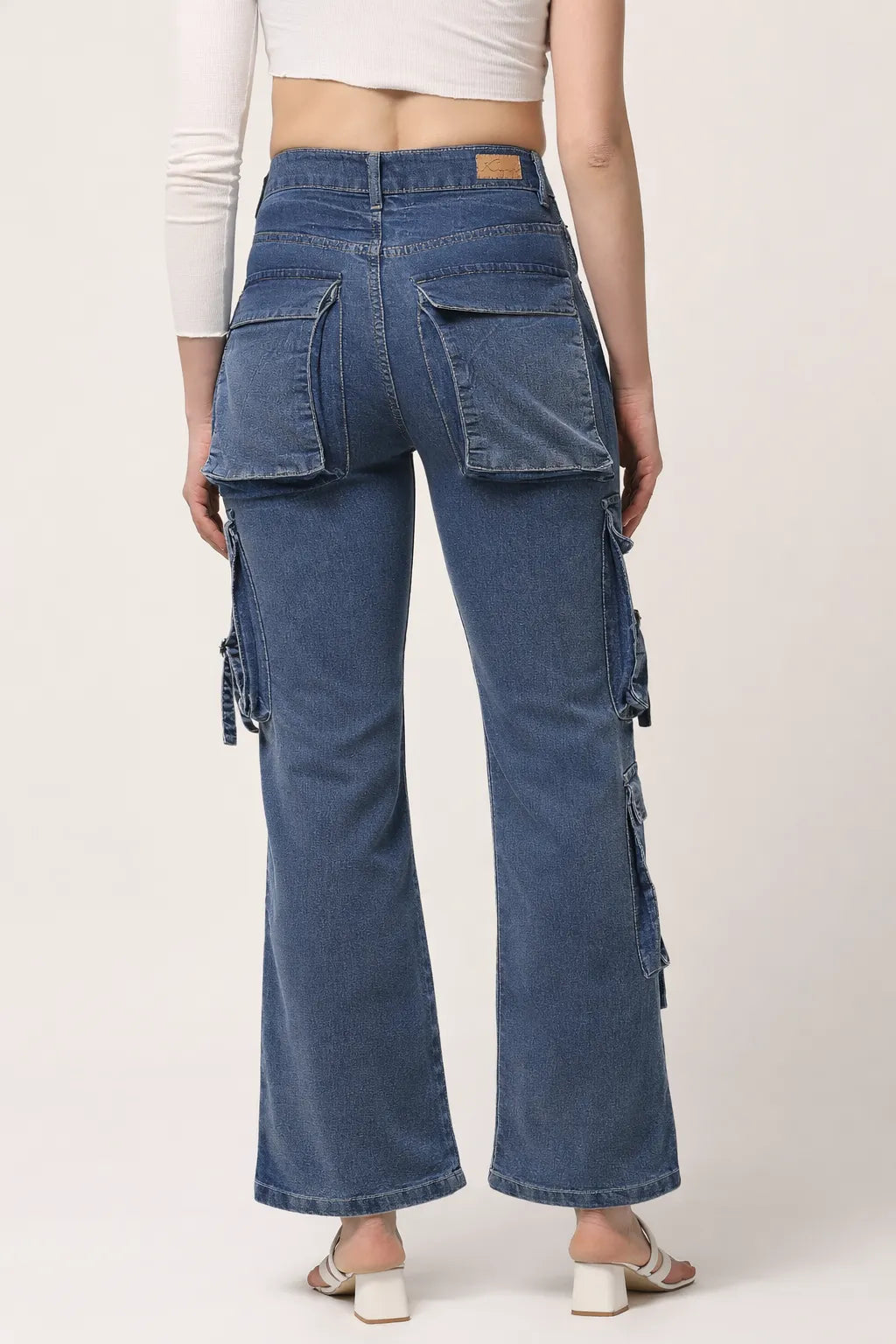 Kagad Jeans Womens High Rise Wide Leg Regular Fit Mid blue Denim Cargo Pocket Jeans - Style Code "KGDJGR-404007